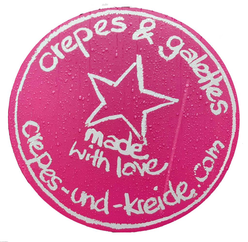 Wie auf den Fotos zu sehen ist, biete ich Crêpes an, dünne Pfannkuchen – in Frankreich auch als Crêpes und Galettes bezeichnet – in einem kleinen, schwarzen Verkaufswagen. Die Idee, dass mein Wagen eine Kreidetafel ist, kam mir „mal so“ beim Lackieren… Von Anfang an wurde das sehr gut angenommen, von Kids wie von Erwachsenen. Wie Du sehen kannst, immer bunt, immer anders und macht Spass. Mir auch, ich freue mich jedesmal über die Kunstwerke und die Malbegeisterung.